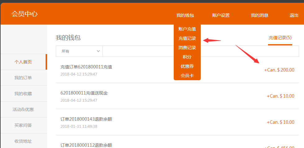 ③.開啟之后,前臺(tái)會(huì)員才可以看到充值入口。以pc為例,進(jìn)入會(huì)員中心---我的錢包增加了賬戶充值和充值記錄