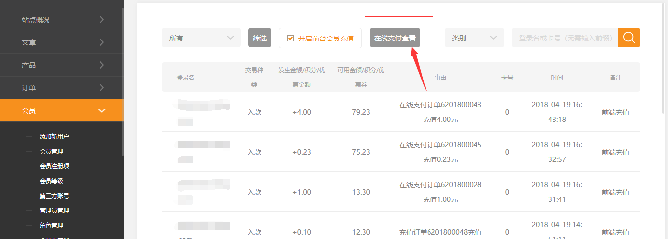 ⑥.后臺(tái)---會(huì)員---會(huì)員交易里,點(diǎn)擊“在線支付查看”,管理員可以查看用戶的在線支付訂單