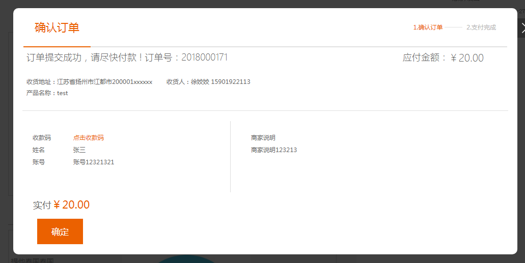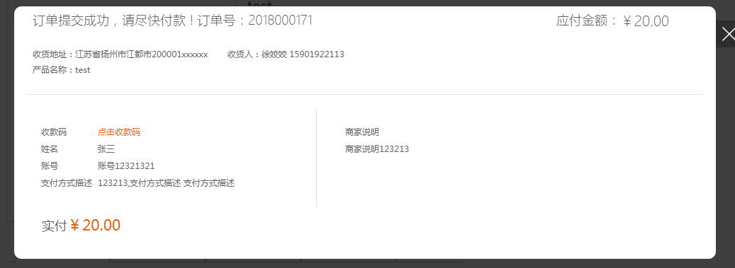 ③.pc前臺(tái)頁(yè)面預(yù)覽:提交訂單之后,會(huì)出現(xiàn)下方彈窗,展示了后臺(tái)填寫(xiě)的相關(guān)收款信息