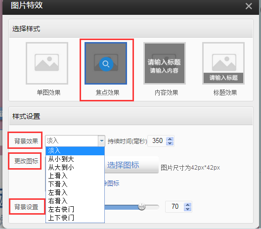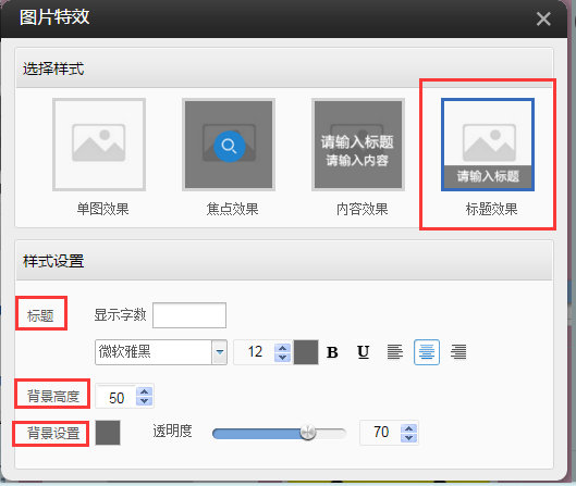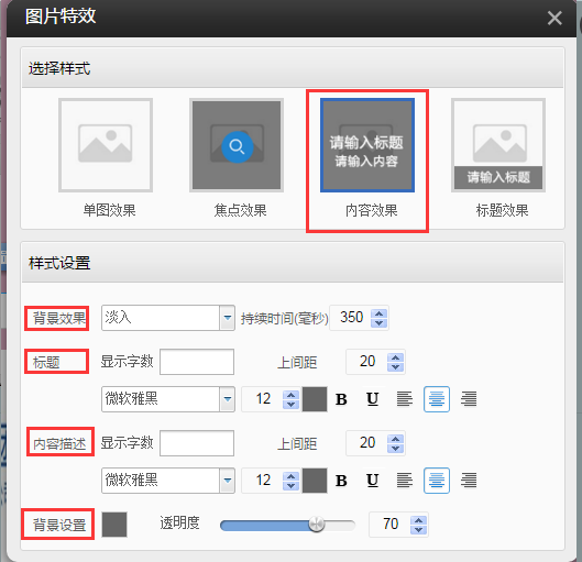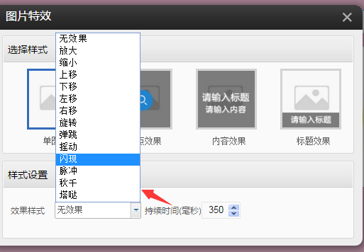 ②.提供了如下四種樣式的圖片特效,選擇單圖效果,在樣式設(shè)置中的效果樣式可以選擇某一種,鼠標懸停圖片,圖片將出現(xiàn)對應(yīng)的效果
