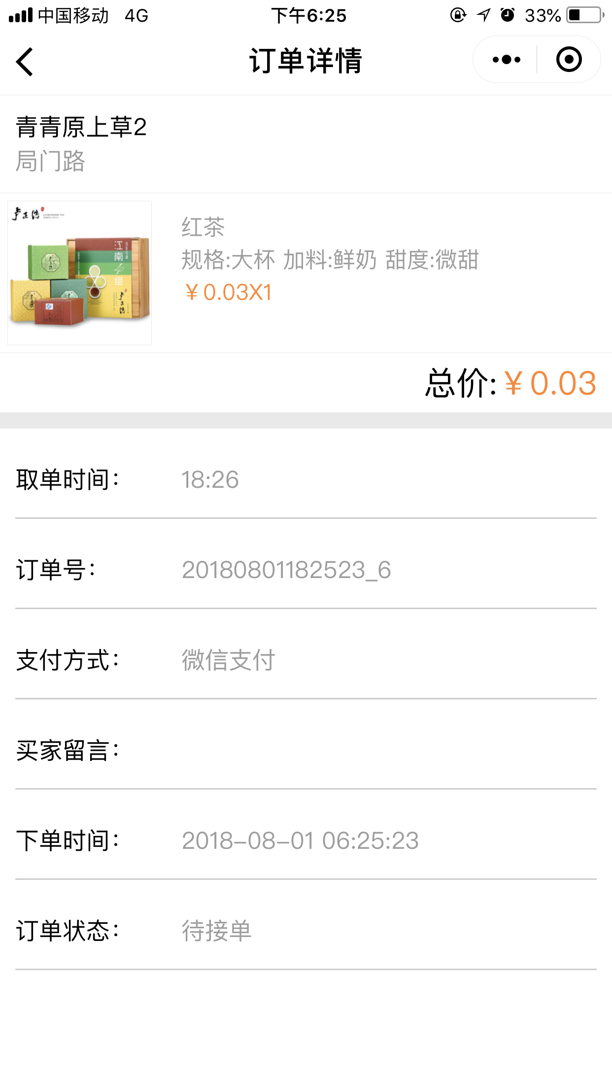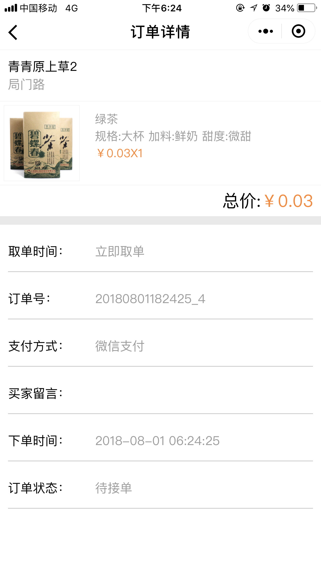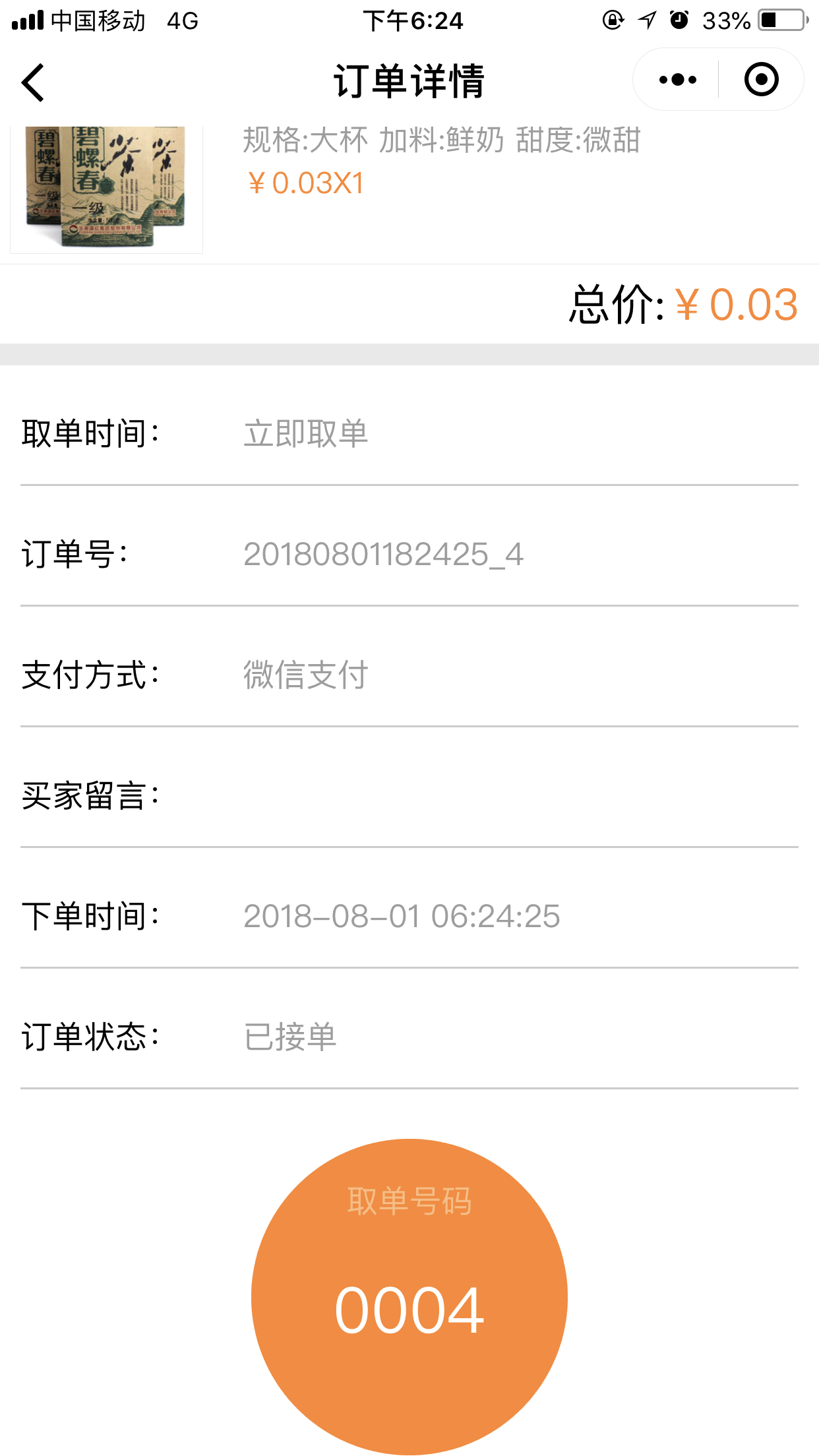 4.在前臺,用戶點(diǎn)擊“開始點(diǎn)單”可以根據(jù)位置匹配到最近的店面,并且可以選擇取餐的方式“立即取餐”或“稍晚取餐”,進(jìn)入點(diǎn)單列表頁我們添加菜品時(shí),可以選擇我們在后臺添加的“配料”、“口味”、以及“規(guī)格”等,選擇完畢之后,點(diǎn)擊“去結(jié)算”跳轉(zhuǎn)到提交訂單頁面,取單時(shí)間根據(jù)用戶的選擇會顯示為“立即取單”或者為“取單的時(shí)間點(diǎn)”,提交訂單后,會跳轉(zhuǎn)到“訂單詳情”頁面,當(dāng)商家在后臺點(diǎn)擊“接單”接單后,會有“取餐碼”顯示出來,如圖所示: