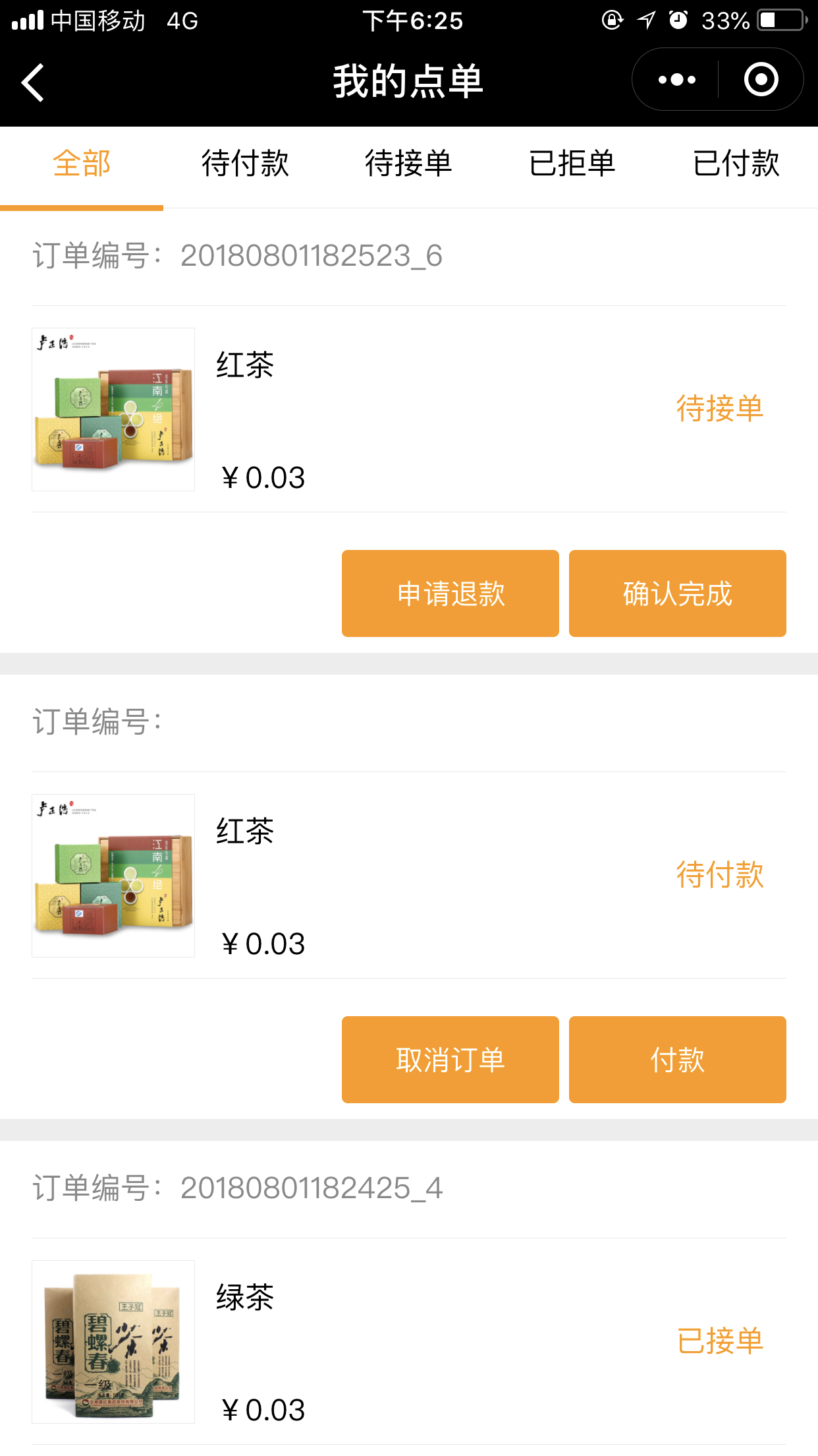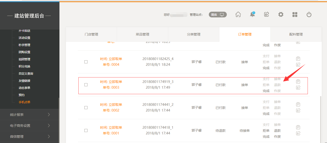 6.在后臺“訂單管理”中,當(dāng)商家已經(jīng)接單后,前臺用戶則不能申請“退款”,如果商家沒有接單,則用戶可以進(jìn)行“申請退款操作”,如圖所示:
