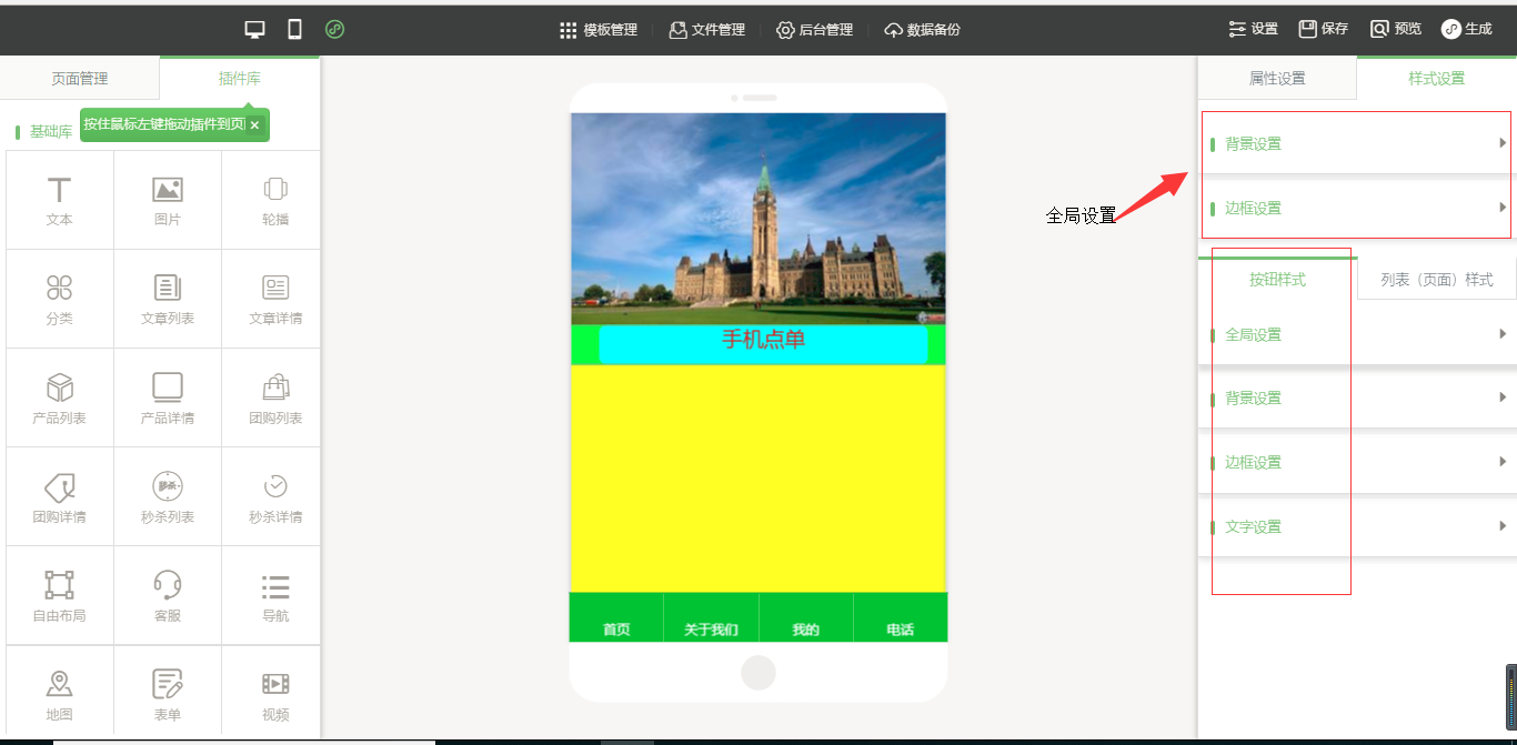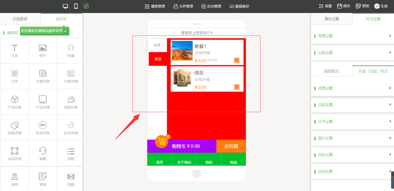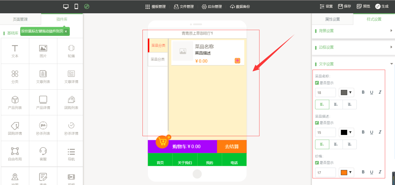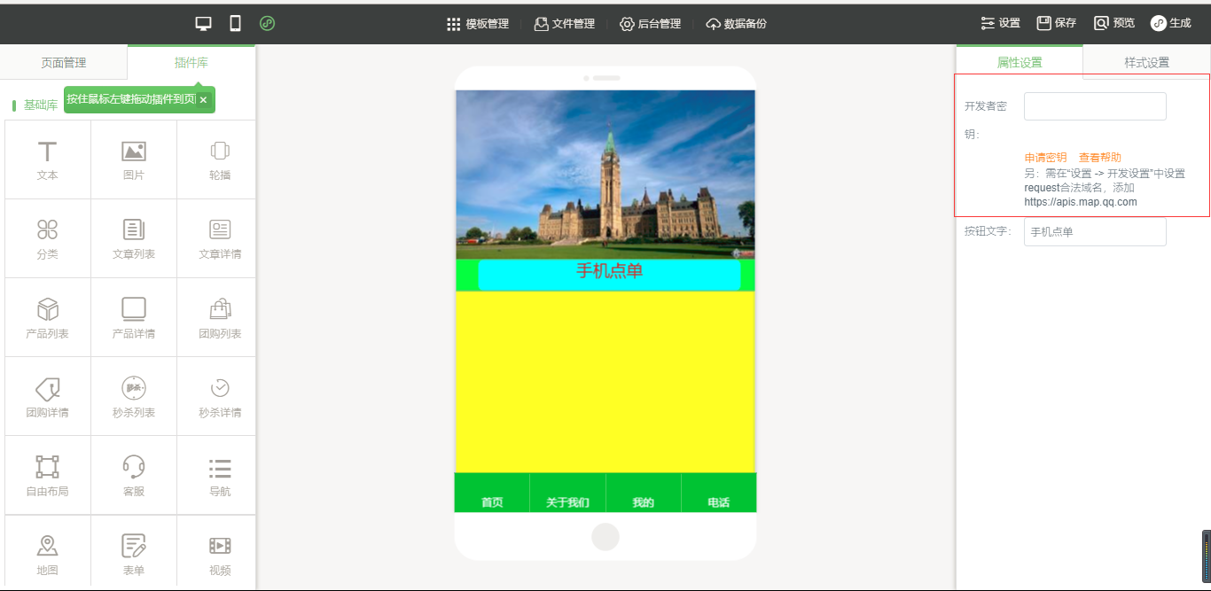 3.在小程序編輯器中,拖入插件“手機(jī)點(diǎn)單”,該插件為內(nèi)頁插件,我們可以在頁面中給小程序頁面進(jìn)行布局,然后點(diǎn)擊“開始點(diǎn)單”按鈕進(jìn)行屬性及樣式設(shè)置,由于需要店面的準(zhǔn)確定位,因此需要申請地圖的API密鑰,具體操作可以看幫助文檔,在樣式設(shè)置中,“背景設(shè)置”與“邊框設(shè)置”是全局設(shè)置,是針對該小程序插件頁面的整體設(shè)置,“按鈕樣式”則是僅針對于“手機(jī)點(diǎn)單”入口按鈕的設(shè)置;“列表(頁面)設(shè)置”是針對該菜品列表頁的設(shè)置,里面的“文字設(shè)置”中可以設(shè)置需要的顯示項(xiàng),設(shè)置完成之后點(diǎn)擊保存即可(注:當(dāng)后臺沒有添加任何數(shù)據(jù)時(shí),該列表頁中會出現(xiàn)一組假的數(shù)據(jù),僅供參考使用,當(dāng)后臺添加數(shù)據(jù)之后,該列表會自動換成真實(shí)數(shù)據(jù)),如圖所示: