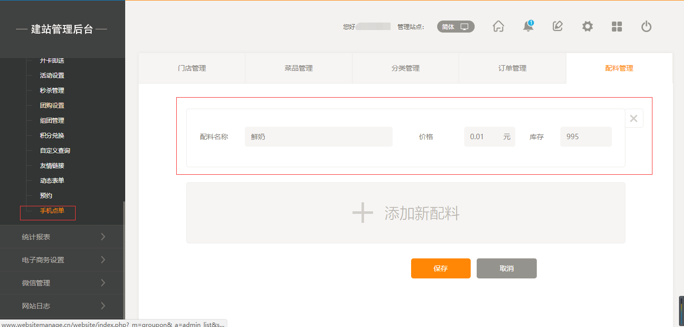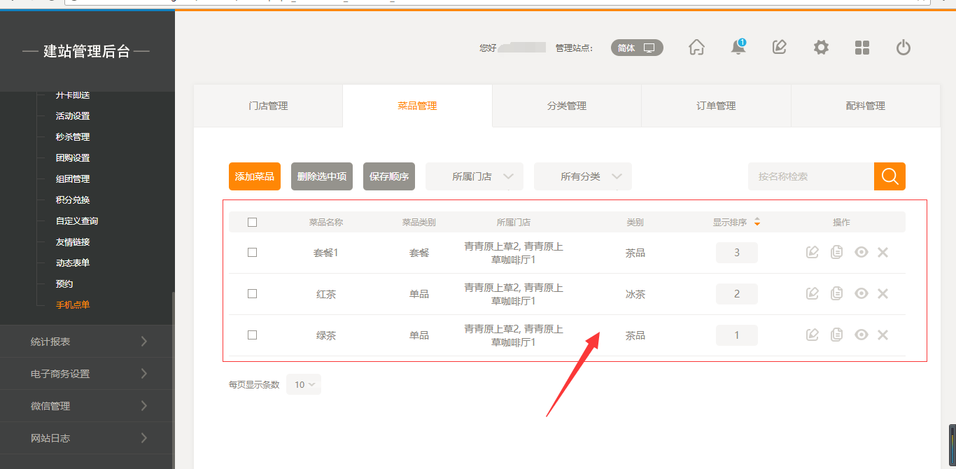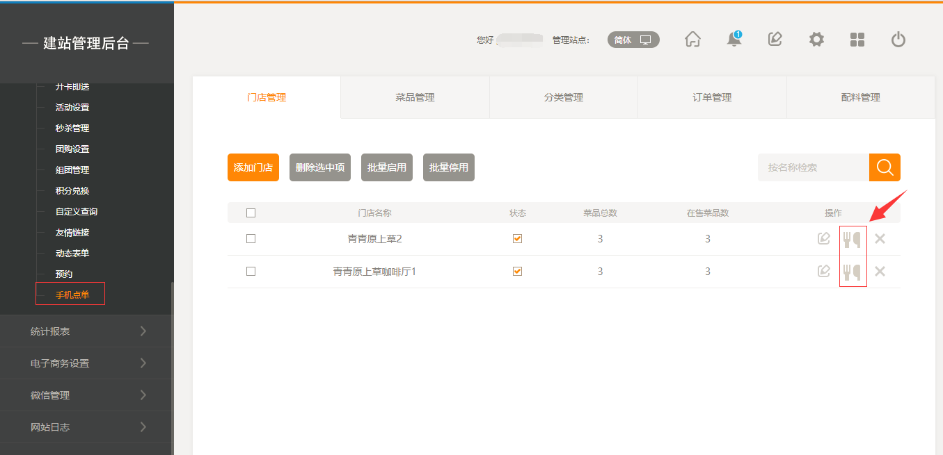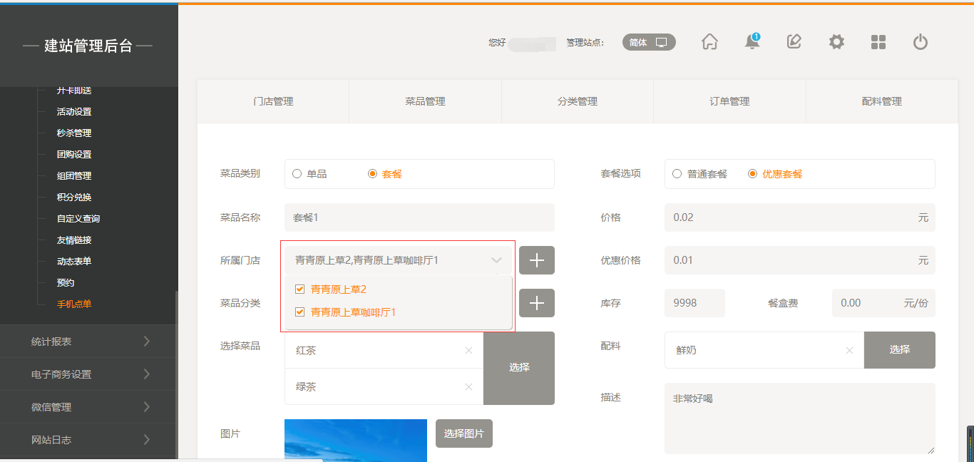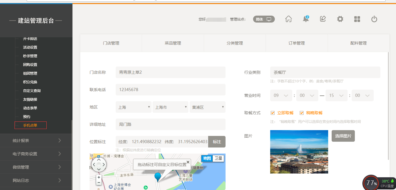 1.首先,點(diǎn)擊“后臺管理”-“手機(jī)點(diǎn)單”-“門店管理”-“添加門店”,填寫完店面信息之后,我們點(diǎn)擊保存即可(注:1.首先需要填寫店面的地址然后可以拖動地圖進(jìn)行精確;2.店面最多添加5家店面),保存之后,我們添加菜品時(shí)有兩個(gè)入口,一個(gè)是店面所對應(yīng)的入口,一個(gè)是在菜品管理中可以選擇所屬店面,如圖所示: