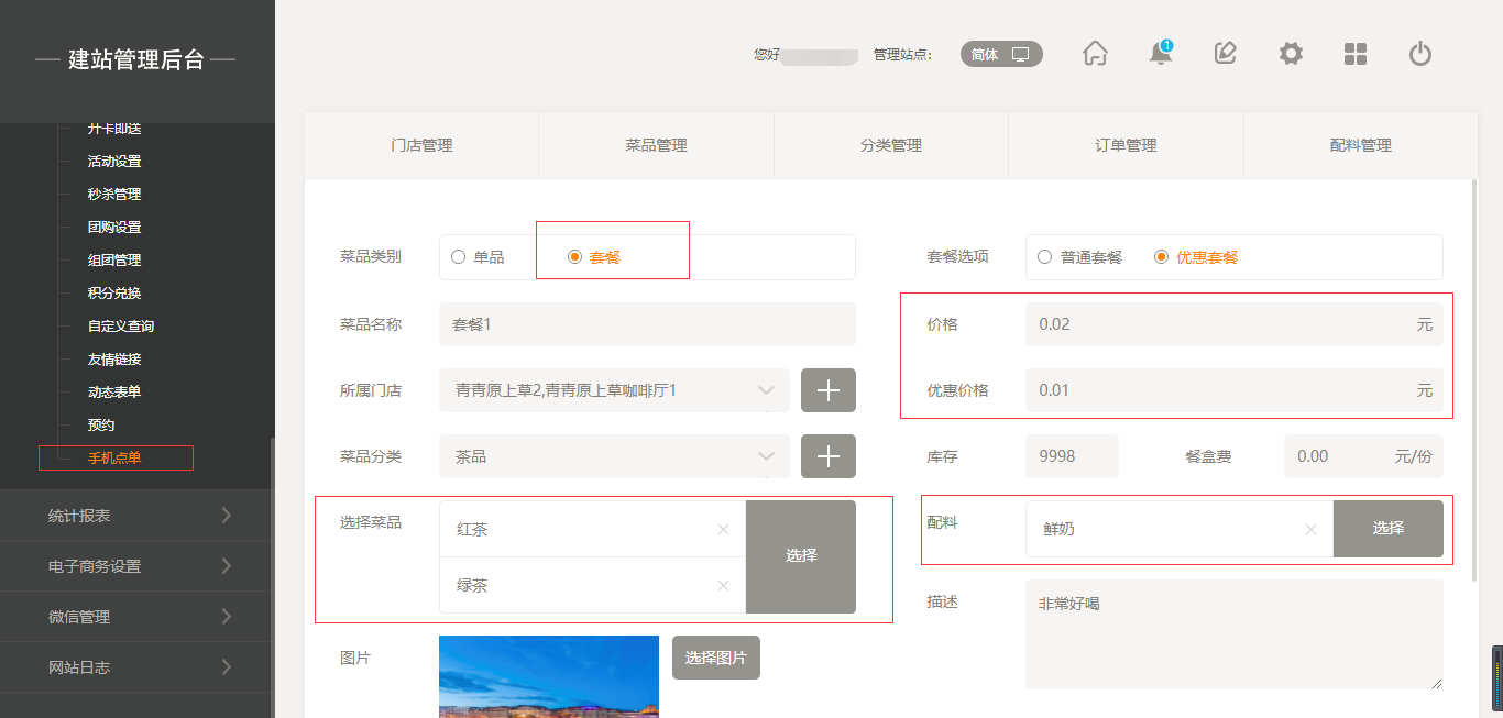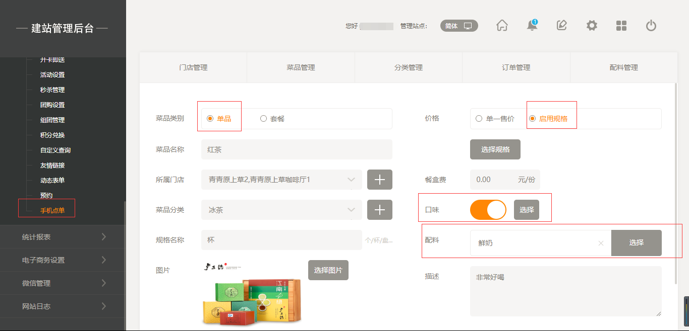 2.點(diǎn)擊“菜品管理”添加菜品,添加菜品時(shí)有兩種選項(xiàng),一個(gè)是“單品”,另一個(gè)是“套餐”,當(dāng)點(diǎn)擊“套餐”時(shí),我們選擇之前添加好的單品進(jìn)行組合即可;當(dāng)添加菜品時(shí),我們也可以給該菜品添加“口味”以及“配料”,同時(shí)我們也可以給該菜品進(jìn)行“規(guī)格”設(shè)置,如“大杯”“小杯”等,在前端添加菜品時(shí)都會體現(xiàn)出來,填寫完成后點(diǎn)擊保存即可,如圖所示: