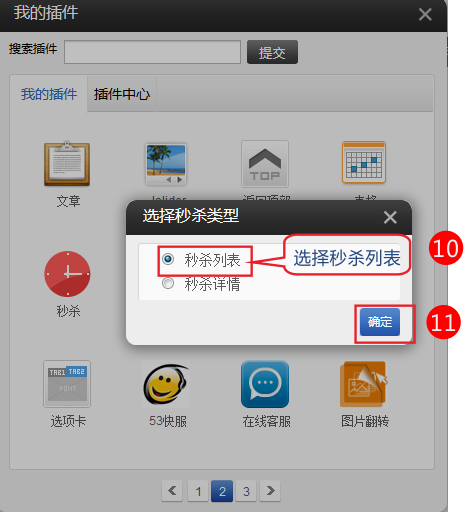 3,建立新頁面后,在此新頁面將“插件”里面的“秒殺插件”拖動出來,系統(tǒng)再次彈出以下選擇框: