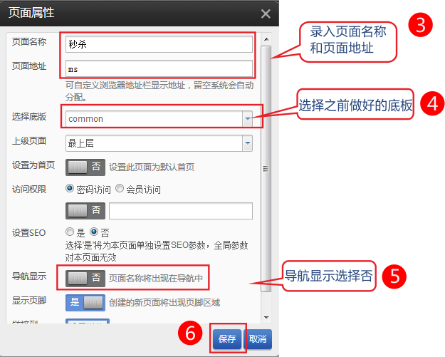2,錄入頁面名稱-網(wǎng)頁地址-選擇好底板-導(dǎo)航頁設(shè)置為不顯示