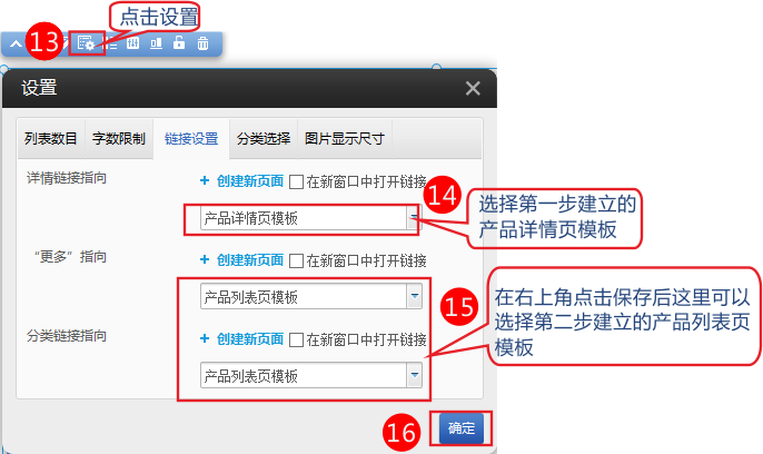 4,模塊上方點擊設(shè)置-鏈接設(shè)置。設(shè)置詳情鏈接和更多指向  分類鏈接指向。