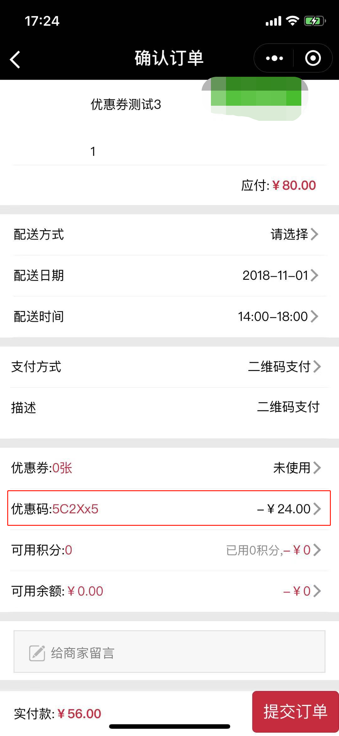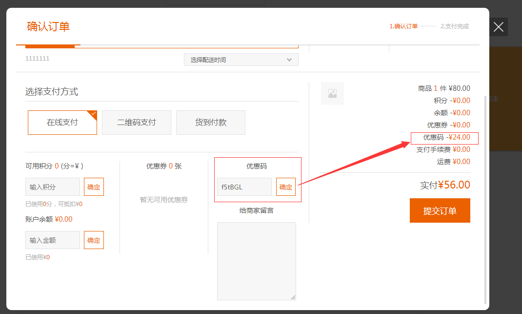 2.在pc端,使用優(yōu)惠碼的界面,輸入優(yōu)惠碼后點(diǎn)擊確定,即可看到優(yōu)惠的金額。如圖所示: