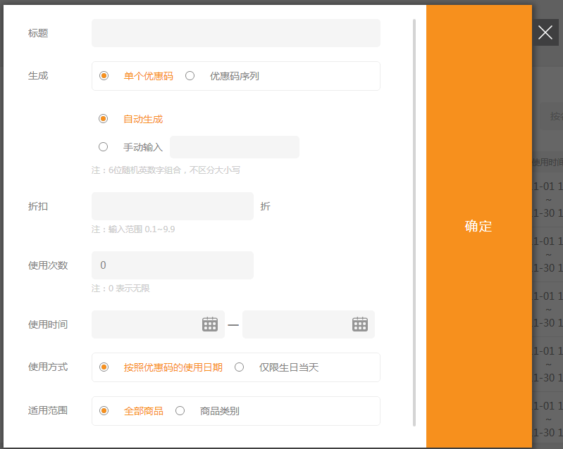 設(shè)置的優(yōu)惠碼使用次數(shù),是指單個(gè)優(yōu)惠碼能被所有會(huì)員使用的總次數(shù)。