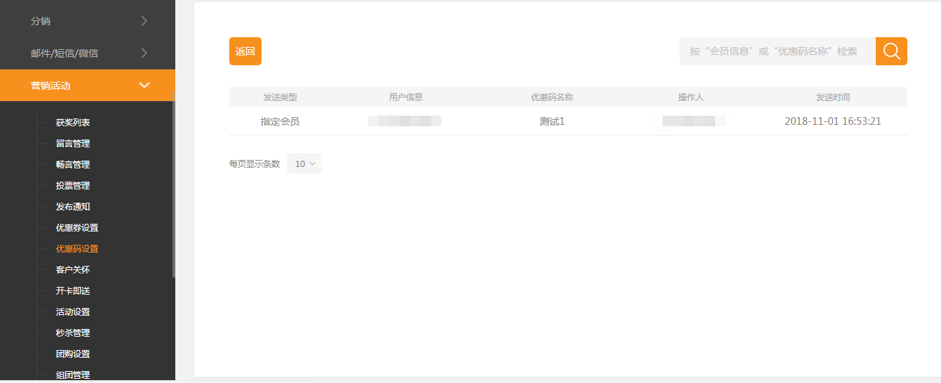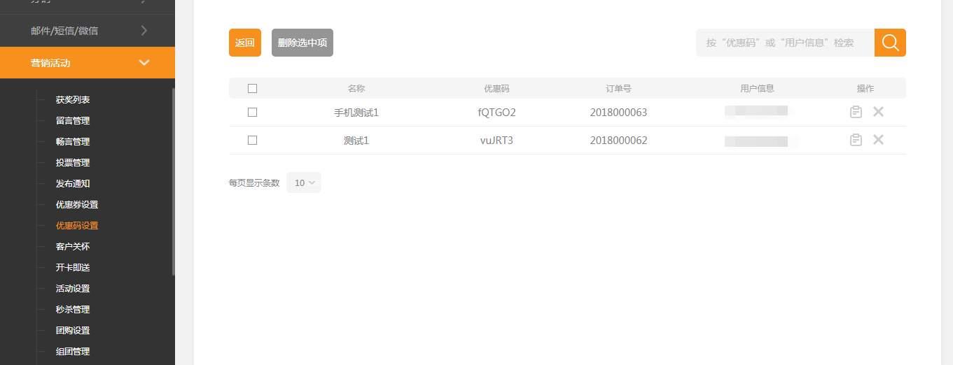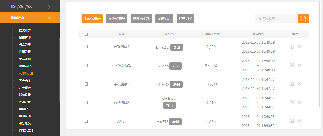 在建站后臺(tái)-“營銷活動(dòng)”-“優(yōu)惠碼設(shè)置”中,可以對(duì)優(yōu)惠碼進(jìn)行瀏覽、復(fù)制、導(dǎo)出等操作,如圖所示: