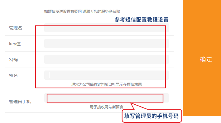 2、開啟模板之后,并且要在短信發(fā)送設(shè)置中輸入管理員手機號碼,之后管理員可在手機上查看新留言