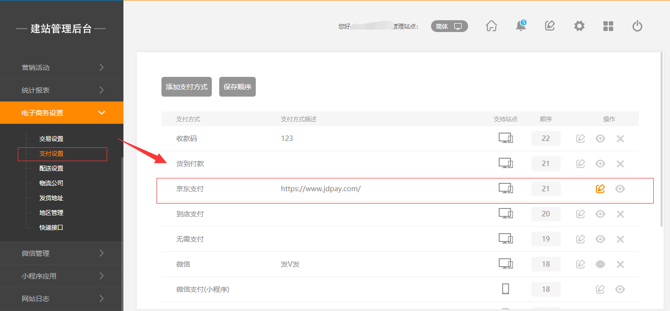 后臺(tái)-“電子商務(wù)設(shè)置”-“支付設(shè)置”-“京東支付”,點(diǎn)擊“編輯”,通過官方鏈接進(jìn)行商戶賬號(hào)申請(qǐng)后(注:請(qǐng)選擇快捷支付)根據(jù)京東支付網(wǎng)站中申請(qǐng)?zhí)崾具M(jìn)行操作,將得到的商戶號(hào)、密鑰等信息填寫完全,并上傳證書后將其開啟,點(diǎn)擊保存即可,如圖所示:
