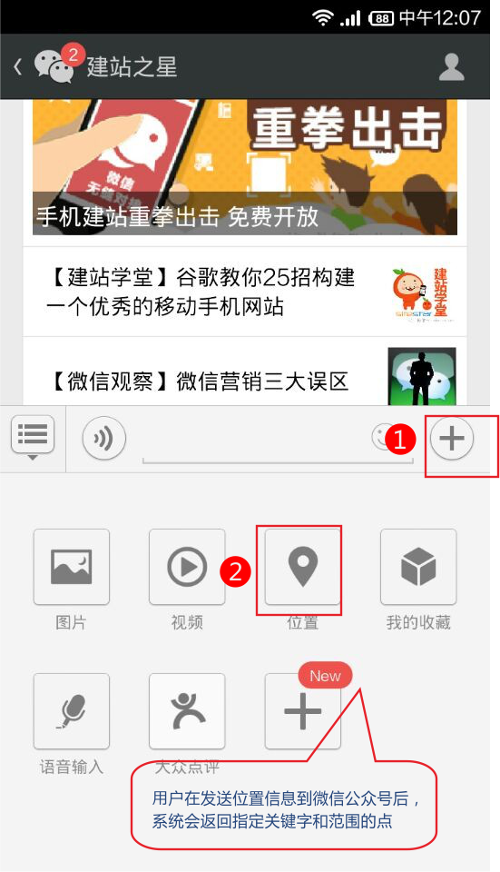 用戶在發(fā)送位置信息到微信公眾號后,系統(tǒng)會返回指定關鍵字和范圍的點