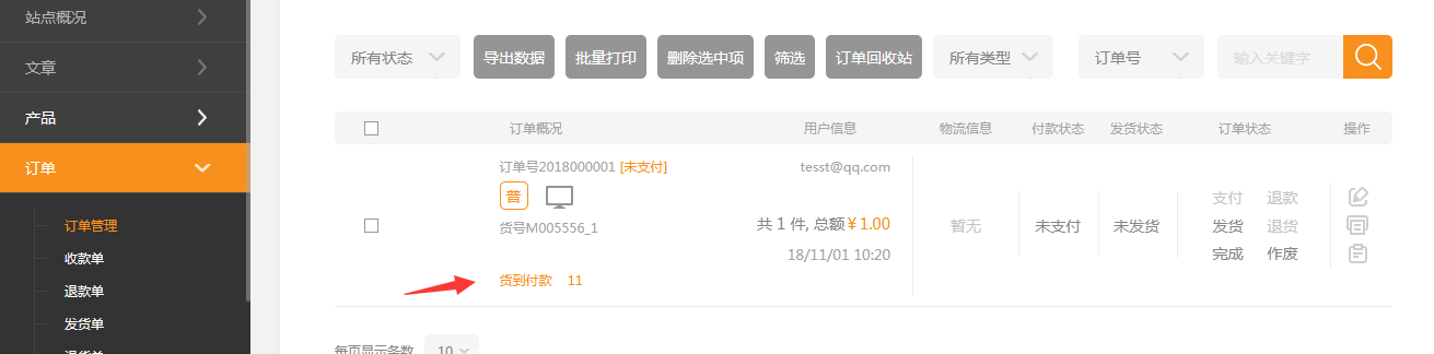 4.在后臺訂單管理中可以看到貨到付款的訂單,點擊發(fā)貨后 支付按紐可以點擊。(由物流公司代收款后,再回到訂單管理中點擊支付即可)