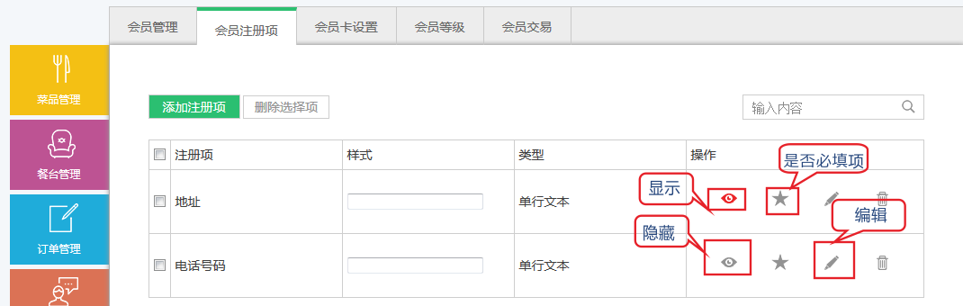 如果想讓某個注冊項在會員中心顯示,點擊變?yōu)榧t色眼睛圖標(biāo)就可以了;不顯示就點擊變?yōu)榛疑劬D標(biāo)。
