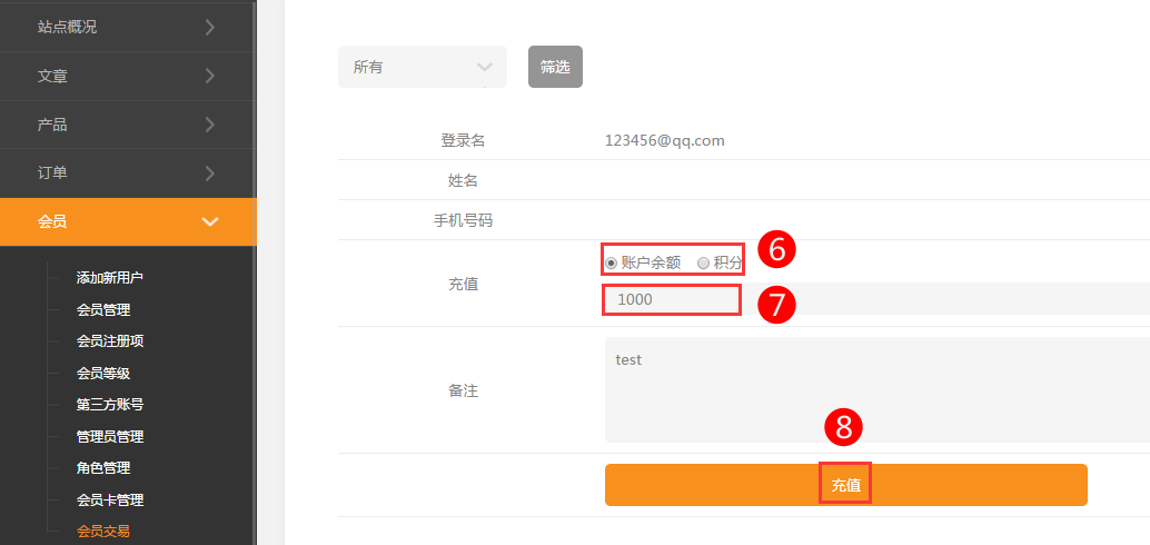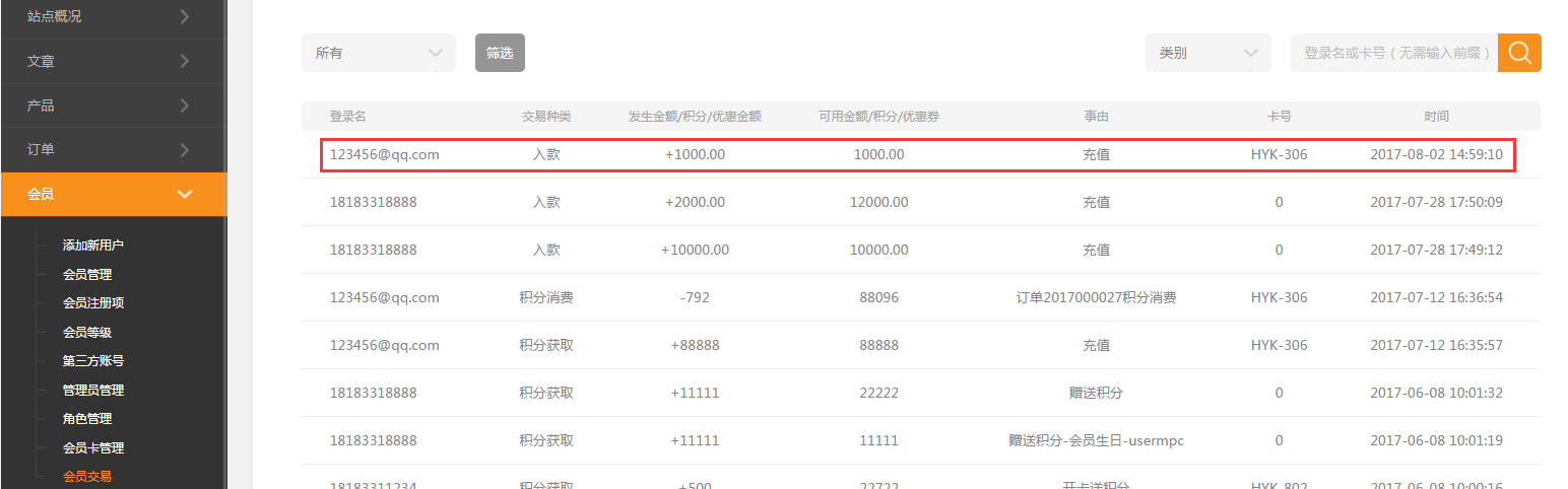 3,充值成功的記錄如下圖所示,【會員消費(fèi)】與【會員充值】同理
