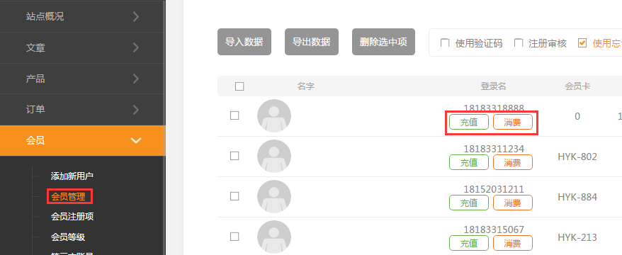 4,會員-會員管理中,點(diǎn)擊會員登錄名下方的【充值】和【消費(fèi)】按鈕,會跳轉(zhuǎn)到該會員的充值或者消費(fèi)界面。