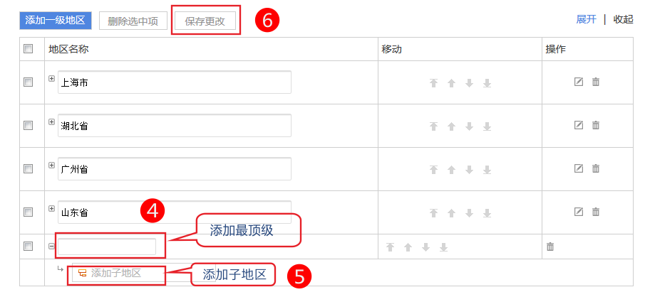 點(diǎn)擊添加頂級(jí)地區(qū)、在列表中點(diǎn)擊添加二級(jí)地區(qū),最多可以添加到第三級(jí)。