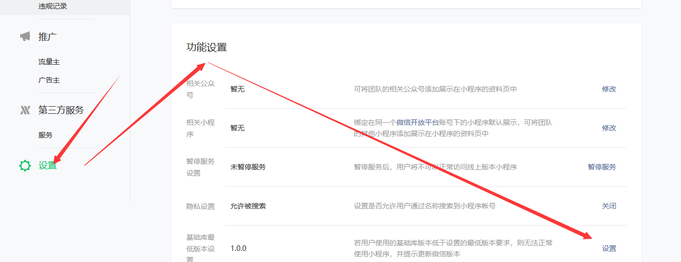 登到小程序后臺(tái)點(diǎn)擊設(shè)置》功能設(shè)置-》基礎(chǔ)庫版本。