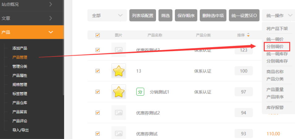 1.在建站后臺(tái),點(diǎn)擊“產(chǎn)品管理”-“統(tǒng)一操作”-“分別調(diào)價(jià)”,設(shè)置過的價(jià)格會(huì)顯示,沒有設(shè)置過的則留空,如圖所示