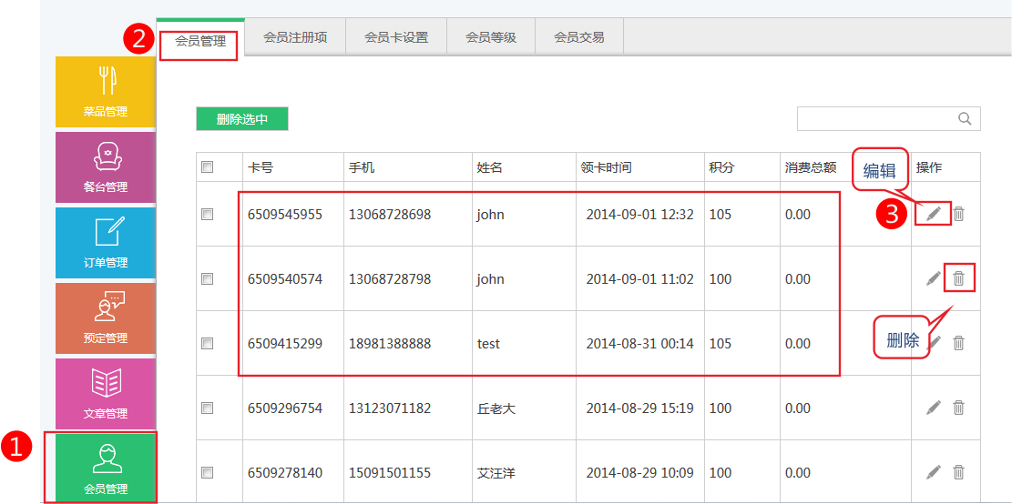 依次點擊會員管理->“會員管理”,可以看到店內(nèi)注冊的所有會員。如圖所示: 點擊編輯可以編輯會員的姓名和手機號碼