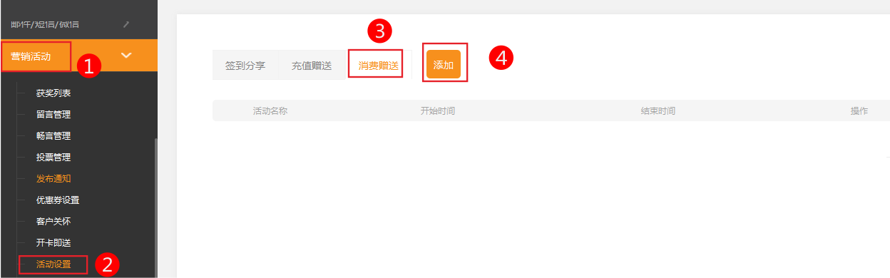 依次點擊活動設(shè)置-》消費贈送-》添加2.設(shè)置活動名稱、活動時間、可贈送的人群、可贈送條件、贈送的內(nèi)容、贈送權(quán)限注意:貨到付款訂單,不會產(chǎn)生贈送。注:贈送券需優(yōu)先在優(yōu)惠券內(nèi)編輯好營銷券才可勾選贈送;【券的開始時間】必須在【消費贈送開始時間】之后,【券的結(jié)束時間】必須在【消費贈送結(jié)束時間】之后,此類券才符合條件,可勾選贈送。一個月未消費送——如一個月未消費送代金券,活動時間1.8-1.10:1.8前一個月未消費用戶系統(tǒng)送券,1.9前一個月未消費用戶送券,1.10前一個月未消費用戶送券。如果消費滿100送10元、滿200也是送10元