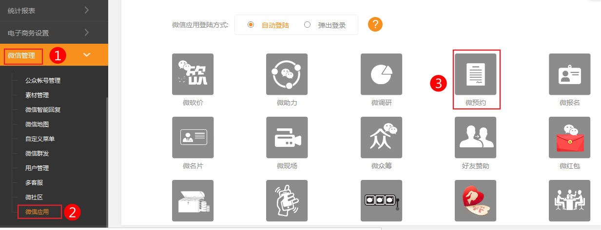 微預約(適用版本手機營銷版) 后臺:可以添加多個預約活動,自由編輯預約表單內(nèi)容,控制預約預約表單限制條件(限定時間,限定每日量,限定全部總量),查看預約結(jié)果 前臺:插件中心,新增微預約插件。 可以選擇使用哪個預約表單 可設(shè)置預約表單顯示樣式 預約需要先注冊會員 活動到期后需要重新添加,直接修改時間客戶參與時會提示活動已結(jié)束 微預約沒有設(shè)置“表單提交限制”時,默認限制為每人只能提交1條 一、微預約的添加管理 1.依次點擊微信管理-》微信應用-》微預約 2.添加新預約 3.輸入項管理 4