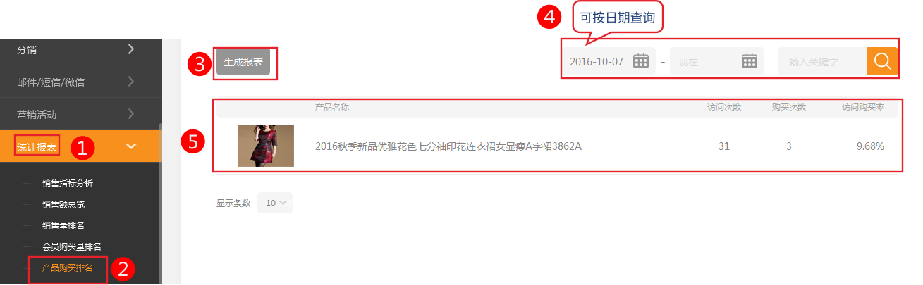 產(chǎn)品購買排名產(chǎn)品購買排名主要查詢網(wǎng)店的銷售指標,其中包括產(chǎn)品用戶訪問次數(shù),購買次數(shù),訪問購買率。