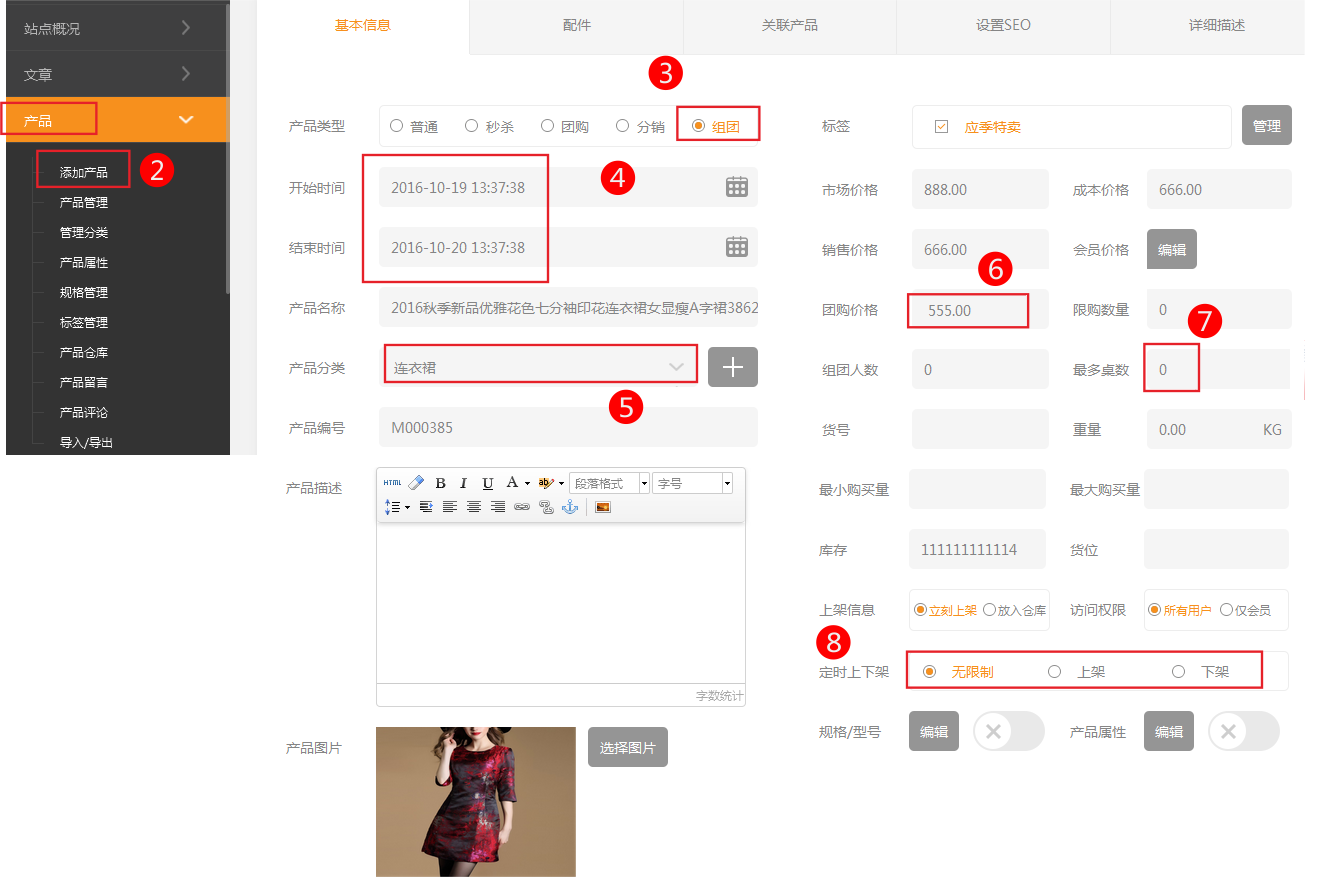1.拉好友團(tuán)購(gòu)可以分團(tuán)購(gòu)買(mǎi),在規(guī)定時(shí)間內(nèi)達(dá)到指定人數(shù)后則購(gòu)買(mǎi)成功,否則超時(shí)未達(dá)指定人數(shù)則退款。(不支持一鍵退款)2.適用版本(手機(jī)營(yíng)銷(xiāo)版)1、添加組團(tuán)類(lèi)型產(chǎn)品在后臺(tái)產(chǎn)品管理-》添加產(chǎn)品-》把產(chǎn)品類(lèi)型設(shè)置為組團(tuán)組團(tuán)人數(shù)設(shè)置為5此例是指一個(gè)用戶(hù)創(chuàng)建一個(gè)團(tuán)需要滿(mǎn)5人才能團(tuán)購(gòu)成功。最多桌數(shù)設(shè)置為10此例是指客戶(hù)最多可以建立10個(gè)團(tuán)。一個(gè)客戶(hù)只能建一個(gè)團(tuán)。(組團(tuán)能用優(yōu)惠劵,會(huì)員等級(jí)有效,積分可以用于抵扣,優(yōu)惠碼是也可以使用(但優(yōu)惠碼和優(yōu)惠劵只能二選一)組團(tuán)不成功商家可以選擇發(fā)貨,或退款給客戶(hù)在未成團(tuán)管理員操作線(xiàn)下退款后已