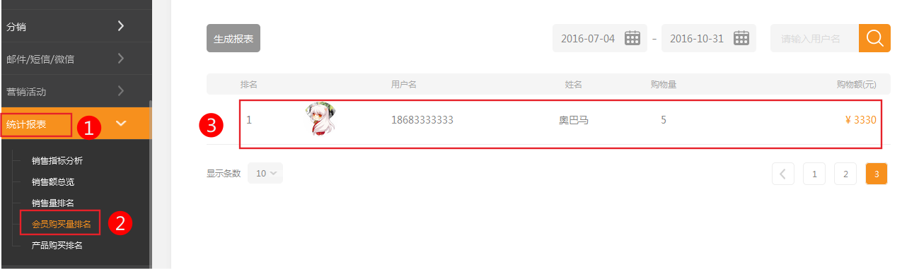 會(huì)員購(gòu)買(mǎi)量排名展示網(wǎng)店會(huì)員的訂單數(shù)和購(gòu)物金額。