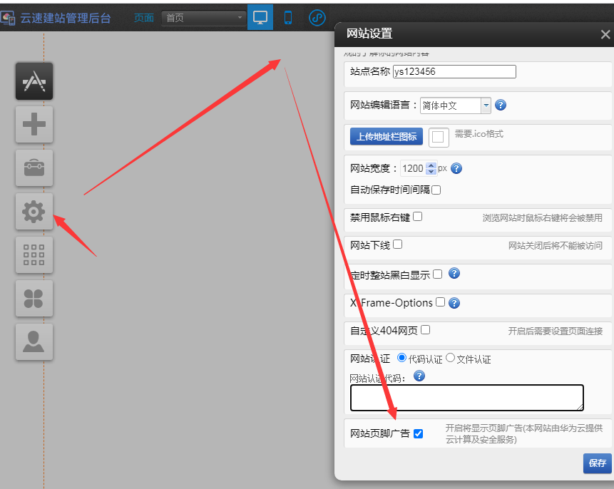 在網(wǎng)站后臺(tái)點(diǎn)擊設(shè)置開(kāi)啟將顯示頁(yè)腳廣告(本網(wǎng)站由華為云提供云計(jì)算及安全服務(wù)),如果不希望開(kāi)啟直接取消勾選后保存即可。