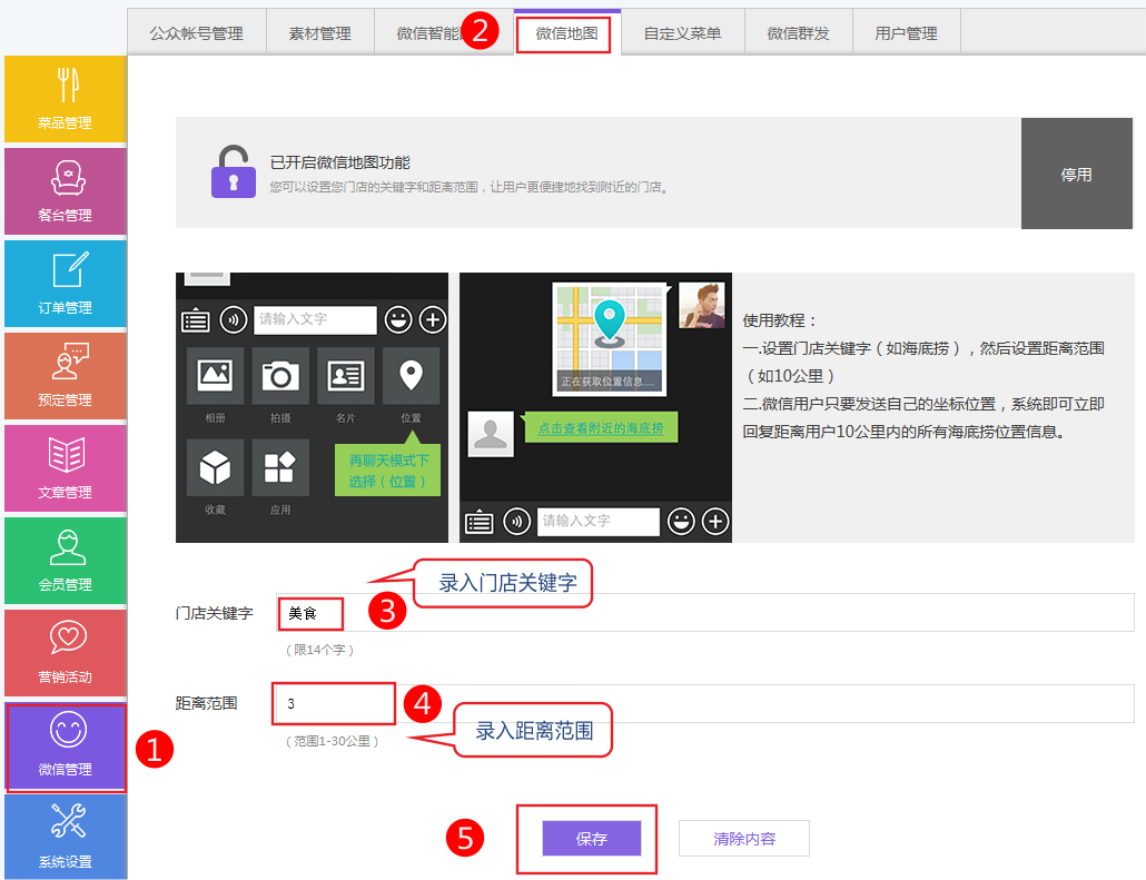 使用教程: 一.設(shè)置門(mén)店關(guān)鍵字(如海底撈),然后設(shè)置距離范圍 (如10公里) 二.微信用戶(hù)只要發(fā)送自己的坐標(biāo)位置,系統(tǒng)即可立即 回復(fù)距離用戶(hù)10公里內(nèi)的所有海底撈位置信息。 如何使用 用戶(hù)在發(fā)送位置信息到微信公眾號(hào)后,系統(tǒng)會(huì)返回指定關(guān)鍵字和范圍的點(diǎn)