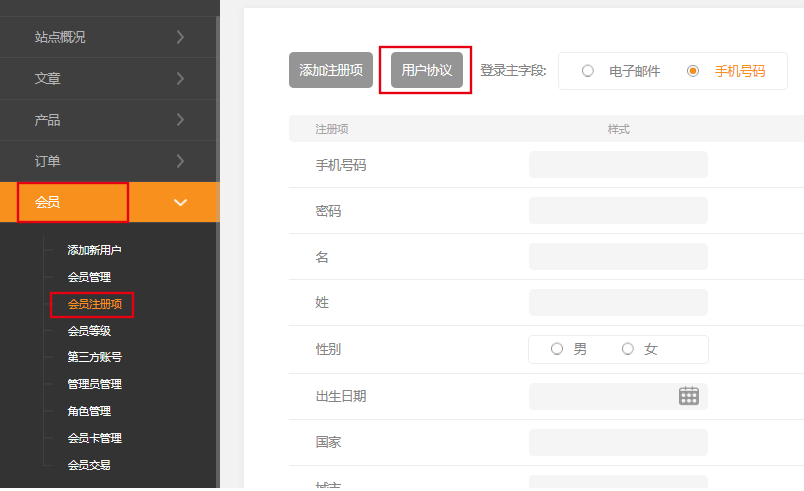 使用注冊(cè)協(xié)議,會(huì)員在注冊(cè)界面必須勾選注冊(cè)協(xié)議,方可注冊(cè)成功。(協(xié)議建議文字在1萬(wàn)以?xún)?nèi))1,在后臺(tái)管理-會(huì)員-會(huì)員注冊(cè)項(xiàng)-用戶(hù)協(xié)議中,開(kāi)啟協(xié)議。并填寫(xiě)好協(xié)議的名名稱(chēng)和內(nèi)容。(3.選擇PC站還是手機(jī)站的會(huì)員注冊(cè)界面來(lái)電顯示協(xié)議。)(4.來(lái)電顯示的開(kāi)關(guān)。)(5.填寫(xiě)協(xié)議名稱(chēng)。)(6.填寫(xiě)協(xié)議內(nèi)容。)2,會(huì)員注冊(cè)界面效果。在會(huì)員彈窗中可以改注冊(cè)協(xié)議名稱(chēng)顏色在建站后臺(tái),“會(huì)員”-“會(huì)員注冊(cè)項(xiàng)”-“用戶(hù)協(xié)議”里,支持同時(shí)設(shè)置多個(gè)協(xié)議,前臺(tái)也會(huì)正確的看到。如圖所示:前臺(tái)展示效果