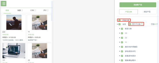 1“顯示子分類”不勾選,選中主分類時(shí)子分類的產(chǎn)品會(huì)同時(shí)顯示出來2“顯示子分類”勾選,選中主分類時(shí)子分類的產(chǎn)品不會(huì)顯示出來,主分類和子分類分開控制。(勾選“所有分類”情況除外)注意:只有“所有分類”被勾選后,后臺(tái)新增的分類才能被默認(rèn)選中