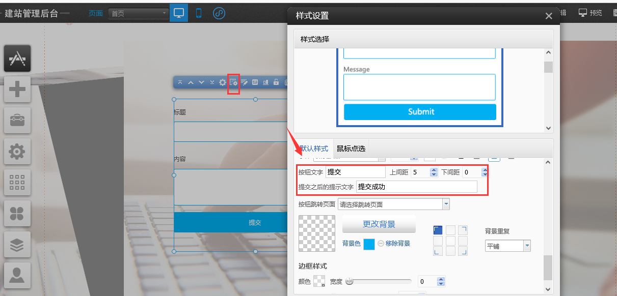 選中留言模塊后點(diǎn)擊樣式設(shè)置-》找到按鈕文字框修改后關(guān)閉窗口即可
