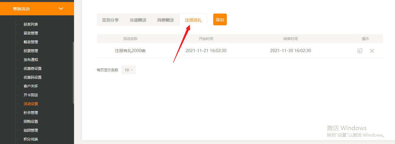 注冊(cè)送禮(建站營銷版,至尊版)1.在后臺(tái)-營銷活動(dòng)-活動(dòng)設(shè)置-增加注冊(cè)送禮-現(xiàn)在新用戶在站點(diǎn)注冊(cè)賬號(hào)后,可享受活動(dòng)贈(zèng)送的積分或優(yōu)惠券,用來提高用戶的注冊(cè)與商品購買意愿,如下圖: