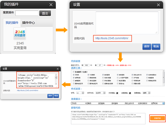 PC和手機(jī)版2345實(shí)用查詢插件(適用版本基礎(chǔ)版、標(biāo)準(zhǔn)版、營銷版) 使用方法:進(jìn)入網(wǎng)站編輯-〉點(diǎn)左側(cè)插件圖標(biāo)-〉插件中心,找到2345實(shí)用查詢插件圖標(biāo),點(diǎn)啟用 可以為您的網(wǎng)站提供快捷實(shí)用查詢 500余款實(shí)用工具供您使用,僅需要復(fù)制粘貼代碼而已 如下圖 1、打開http://tools.2345.com/mfdm/選擇需要的工具并獲取代碼 2、依次點(diǎn)擊插件-我的插件-選中“2345實(shí)用查詢”插件拖拽到您需要的位置。(如果“我的插件”中沒有,請到插件中心啟用) 3、點(diǎn)擊設(shè)置-》粘貼之前獲取的代碼-》保存 4、添加