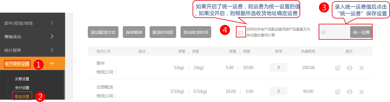 配送方式,指的是店主將顧客購買的商品,送到顧客手中所采用的運(yùn)送方式,如:中國郵政EMS、門店自取等。 本小節(jié)共包含3點(diǎn)。1、通過本部分的設(shè)置,您可以設(shè)置全國統(tǒng)一價并且自動計算配送費(fèi)用的配送方式。 添加物流公司 設(shè)置配送費(fèi)用 例如:在商店中增加一種針對全國統(tǒng)一價的配送方式,配送費(fèi)用首重1公斤5元,每續(xù)重1公斤加5元。 2、添加物流公司 物流公司會出現(xiàn)在配送方式及訂單信息中,供會員查詢物流狀態(tài),需要預(yù)先設(shè)置。 依次在后臺點(diǎn)擊電子商務(wù)設(shè)置-物流公司點(diǎn)擊添加->錄入公司名稱和網(wǎng)站地址 3、設(shè)置配送方式