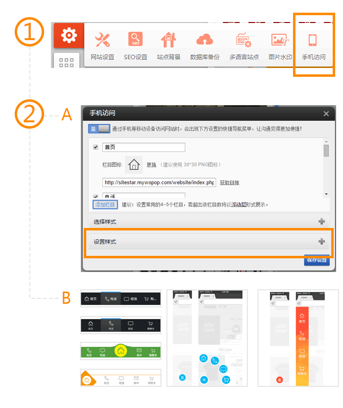 手機訪問-營銷版底部導航基礎版和標準版可通過選擇新版類型體驗到營銷版手機訪問效果注意:此功能在部份手機微信,及瀏覽器中有兼容性問題。會出現(xiàn)底部導航浮動到中間部份。請根據(jù)需要判斷是否啟用。營銷版「手機訪問」功能(如圖①~②)在通過手機等移動設備瀏覽網(wǎng)站時,會在網(wǎng)站底部固定顯示設置的快捷導航菜單,讓溝通變得更加便捷。該功能提供了6種不同風格的主題(如圖②-B),支持自定義欄目(包括標題、圖標及鏈接)以及定制個性化欄目樣式(如圖②-A)基礎版和標準版可通過選擇新版類型體驗到營銷版手機訪問效果如何設置指定頁面顯