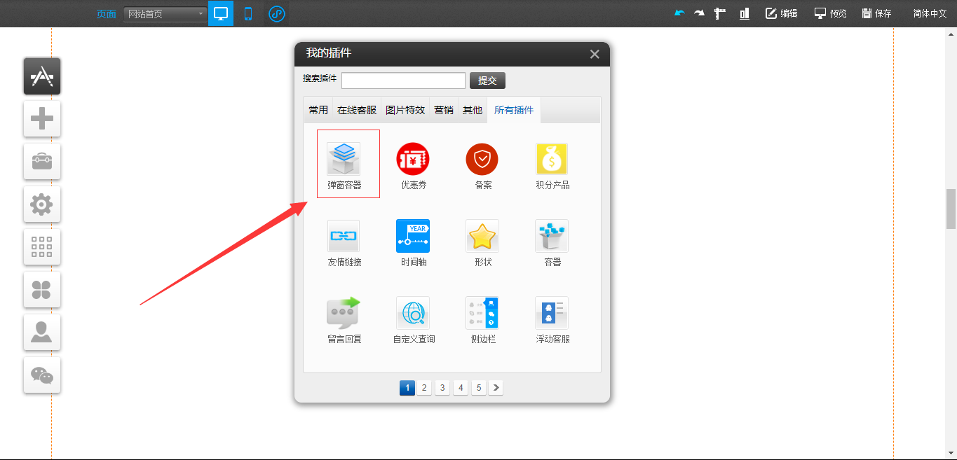 僅支持pc版。1.在PC編輯器中,點開“插件”,拖入“彈窗容器”插件,點擊“生成彈窗”,在“彈窗容器”中點擊“樣式設置”可以對該容器的大小、關閉按鈕樣式以及遮罩樣式進行設置,點擊“選擇插件”對可以拖入“文本”、“圖片”、“視頻”、“線條”、“站內(nèi)搜索”以及“按鈕”插件,“動畫設置”是可以對該模塊的展現(xiàn)形式進行設置,編輯完成后點擊白色容器的“X”只是暫時在編輯器中隱藏了該編輯模塊,如果需要徹底刪除,需要在“生成彈窗”處關閉,并且支持將“生成彈窗”任意拖動到編輯器中的任意地方放置,如圖所示: