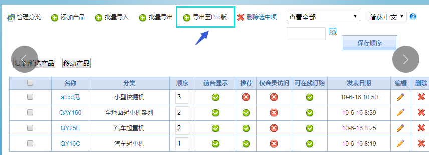 下載版v2.7_build140505導入至Pro版首先下載版要升級到最新版本v2.7_build140505,并按照論壇操作更新程序。一、下載版產(chǎn)品導入到建站之星Pro版。1、登錄你的網(wǎng)站后臺,并進入產(chǎn)品管理頁面,將產(chǎn)品“導出至Pro版”,操作如下:此操作導出下載版CVS數(shù)據(jù)后。再導入Pro版2、分類處理,導入后分類使用Pro版功能批量處理分類,選擇對應分類。對分類處理有要求,在下載版導出時應按分類導出,再通過Pro版批理分類功能,選擇對應分類。3、下載版圖片等文件需自行通過FTP下載到電腦,然后上傳至Pro版文件管理器中下載版文件對應FTP