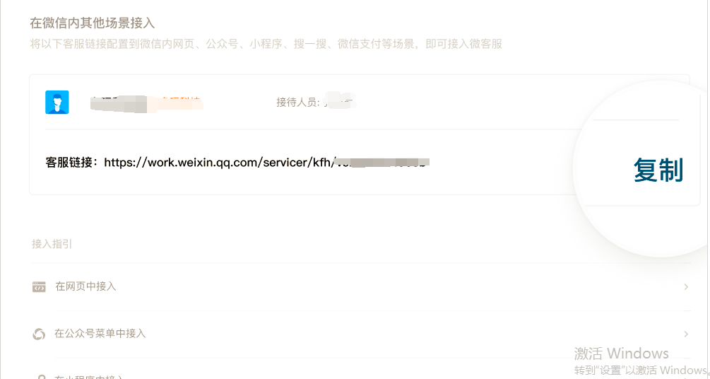 一、獲取鏈接登錄企業(yè)微信管理后臺(https://work.weixin.qq.com/wework_admin),進入「應用管理-應用-微信客服」,選擇接入場景。選擇需要在網(wǎng)頁中接待用戶咨詢的客服帳號,并復制對應的客服鏈接。二、使用場景可自定義客服鏈接在網(wǎng)頁中的展示樣式,例如可將鏈接封裝為文本,按鈕、圖標,也可將客服鏈接轉(zhuǎn)為二維碼等,嵌入網(wǎng)頁中。1.例如在電腦站:可將客服鏈接轉(zhuǎn)為二維碼,嵌入網(wǎng)頁中。用二維碼插件放置如下圖選擇自定義在二維碼內(nèi)容中粘貼獲取到的鏈接2.例如在手機站:可以用按鈕,圖片,文本等直接鏈接,當客戶在瀏覽器點擊訪問時,瀏
