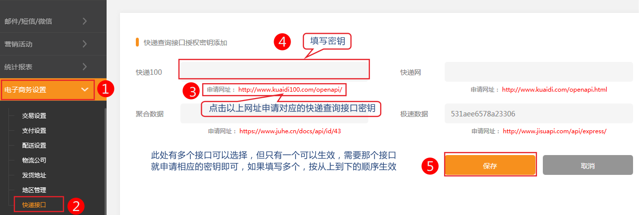 快遞查詢接口設置注意:快遞100基礎版不支持主流快遞,如三通一達、順豐、京東、EMS、德邦、天天、百世、郵政等主流快遞的查詢。1.訂單物流查詢本系統(tǒng)支持四個平臺,商家需要去平臺申請接口使用權限并填寫接口配置即可正常使用!2.使用版本(PC營銷版+手機營銷版+小程序)3.以下4個接口任選其中一種使用,如果都填寫將按順序使用。將申請到的快遞秘鑰填入對應的快遞接口。4,如何申請快遞接口?以快遞100免費版申請舉例,請參考:https://www.kuaidi100.com/help/qa.shtml#qa055,在電子商務設置-物流公司中添加物流公司名稱和代碼。6.在