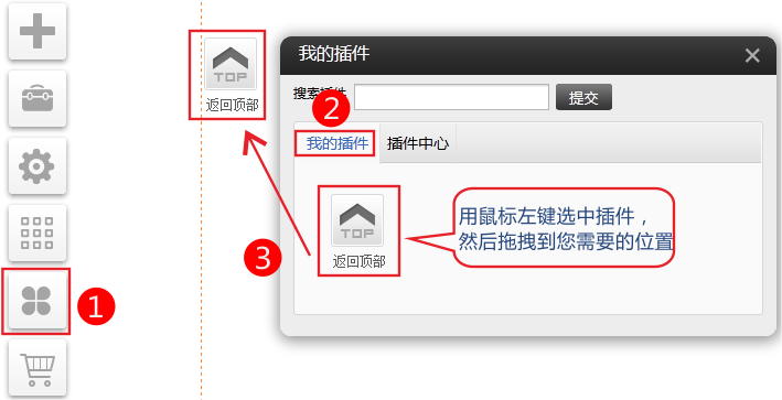 PC版插件(適用版本基礎版、標準版、營銷版) 返回頂部插件功能 當頁面過長時,可以通過返回頂部圖標快速跳轉(zhuǎn)至頁面頂端 系統(tǒng)默認提供24種樣式可供選擇,自定義樣式支持設定默認圖片和鼠標懸停時的圖片 支持設定固定顯示或隨滾動條滑動顯示,支持設定距離瀏覽器底部以及頁面右邊的數(shù)值 1、依次點擊插件-我的插件-選中“返回頂部”插件拖拽到您需要的位置。(如果“我的插件”中沒有,請到插件中心選啟用) 2、點擊設置,配置返回頂部的樣式 滑動顯示是指頁面滑動到一定距離時顯示返回頂部圖標。 3、