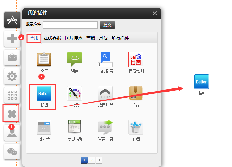 PC和手機版按鈕插件(適用版本基礎版、標準版、營銷版)通過本部分的操作,您可順利為您的網站設置按鈕插件。系統(tǒng)提供12種按鈕樣式可供選擇支持設置超級鏈接支持客戶自定義按鈕顯示樣式:文字,背景,邊框,鼠標經過等設置1、依次點擊插件-常用-選中“按鈕”插件拖拽到您需要的位置。2.點擊設置可以配置按鈕文本和鏈接,并選擇樣式。設置鏈接按鈕支持透明的樣式注意選最后一個樣式將背景設置為透明即可3、按鈕復制功能以pc版為例,在編輯器中拖入“按鈕”插件,點擊“復制”,編輯文本(注:文本字數(shù)限100以內)后點擊保存,前臺點擊按鈕