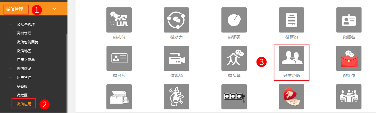 好友贊助適用版本手機(jī)營銷版本微信公眾號需要是認(rèn)證的服務(wù)號并需要開通微信支付功能,并在電子商務(wù)管理-》支付設(shè)置中設(shè)置好微信支付功能。(插件支持一鍵退款)①點擊“申請好友贊助”,分享朋友圈/小伙伴,呼朋喚友來幫忙?、诤糜腰c擊“贊助”,選擇贊助金額,即可幫您付款!好了,證明友情的時候到了??!1.依次點擊微信管理-》微信應(yīng)用-》好友贊助2、添加好友贊助。建議上傳的頁頭部圖片像素為:640*425備注:活動時間只有在“開始時間”和“結(jié)束時間”都不為0時才做限制注意關(guān)聯(lián)產(chǎn)品只能是不帶規(guī)格的普通產(chǎn)品獲取一鍵關(guān)注鏈接請參考一鍵關(guān)
