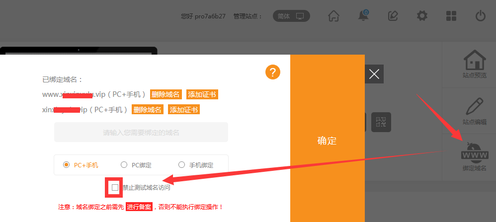在網(wǎng)站后臺-》點擊綁定域名。然后勾選禁用測試域名即可 禁用后訪問測試地址會提示為