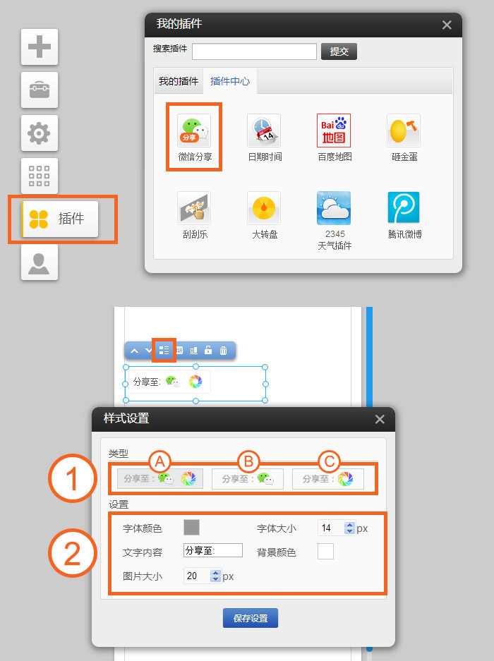 插件-微信分享適用版本版(微建站、微餐飲、手機(jī)營銷版)通過此插件可以在微信里實現(xiàn)分享當(dāng)前頁面1用戶可以選擇3種分享類型a分享至微信好友或微信朋友圈b分享至微信好友c分享至微信朋友圈2支持文字顏色,字體大小,文字內(nèi)容,圖片大小,背景顏色設(shè)定可通過調(diào)整字體大小和圖片大小來設(shè)置插件的寬度和高度
