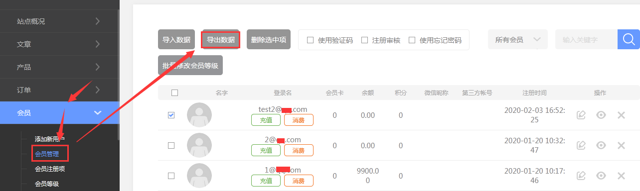 在網(wǎng)站后臺-》會員-》會員管理中需要導(dǎo)出數(shù)據(jù)導(dǎo)出后內(nèi)容格式如下:按上面格式填寫好數(shù)據(jù)后密碼項填寫7c4a8d09ca3762af61e59520943dc26494f8941b那么對應(yīng)的密碼值為123456注意:不能導(dǎo)入分銷關(guān)系。并且導(dǎo)入不能覆蓋之前的同會員名的會員。